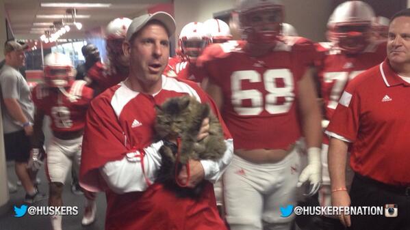 Nebraska coach Bo Pelini brought his cat to a football game and the above picture shows the cat looking relatively bored by the activity all around. Perhaps the cat prefers another team instead or just finds American football a bit strange compared to football as it’s played around the rest of the world.